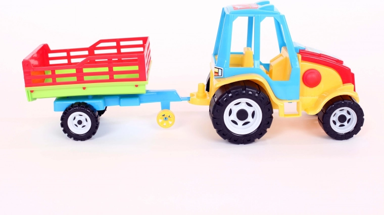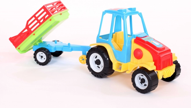 Traktor i standardudførelse sammen med påhængsvogn med hegn. Påhængsvognen er enkeltakslet, torsionsaffjedret og vipper bagud.