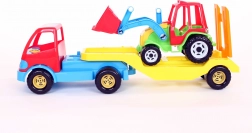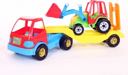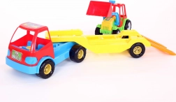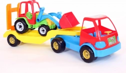 Monster-lastbil til leg på græs med traktor og nedfældelig rampe er et legetøj til de mere krævende børn, der leger ingeniører og chauffører. Traileren er drejelig og kan bruges både derhjemme på tæppet og i sandkassen. Traktoren, som er en del af sættet, kan også købes separat som model 152.