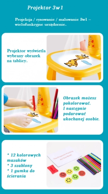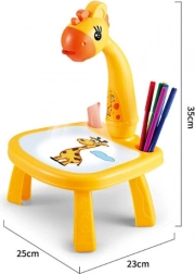 Opdag en sjov måde at lære børn at tegne på: en multifunktionel projektor formet som en gul giraf, der projicerer motiver, som kan tegnes af. Understøtter kreativitet, finmotorik og koncentration. Med 6 projektskabeloner, 12 tuscher og nem betjening er den ideel til små kunstnere fra 3 år.
