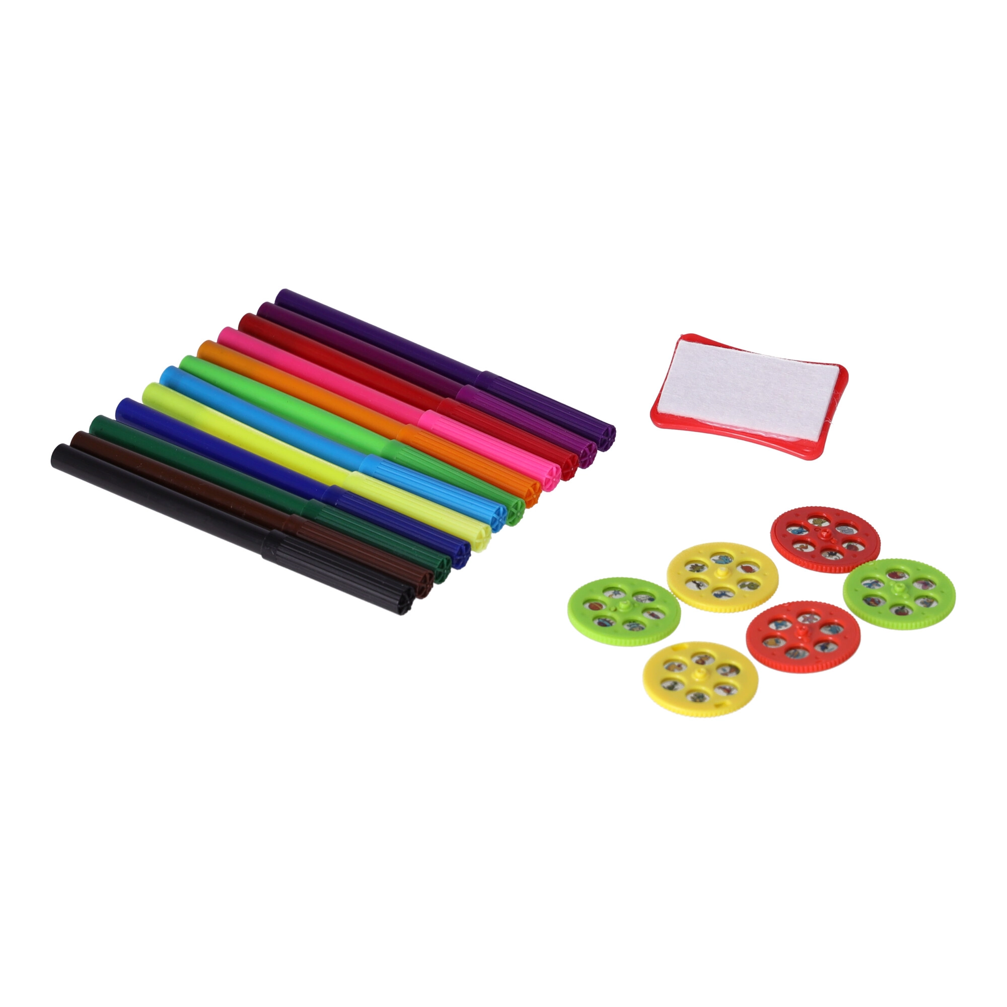 I pakken finder du 6 skabelon-skiver, 12 farvede tuscher, papir og visker. Børnene kan skabe med det samme efter udpakning.