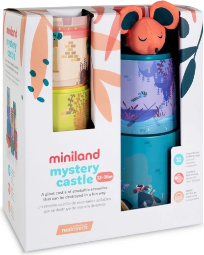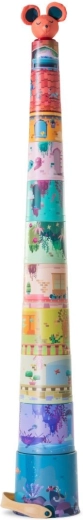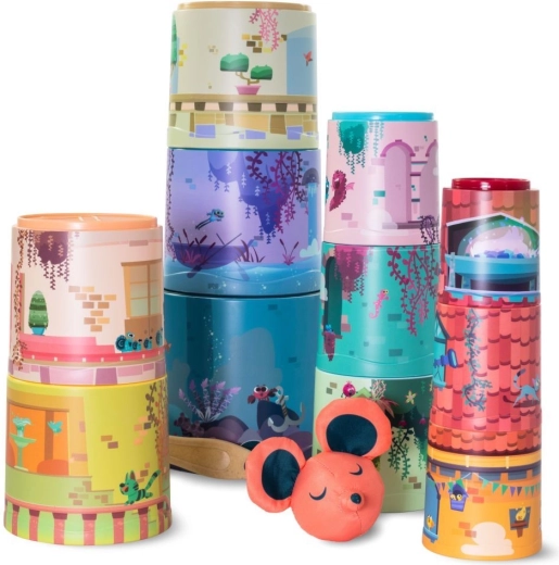 Den lille mus og hendes fantastiske nedrivningsslot – dette tårn af kopper er ren fantasi! Børn kan bygge et kæmpestort tårn af 11 kopper i ét stræk. På kopperne er der illustrationer af forskellige rum i et eventyrslot, i forskellige farver og med mange figurer.