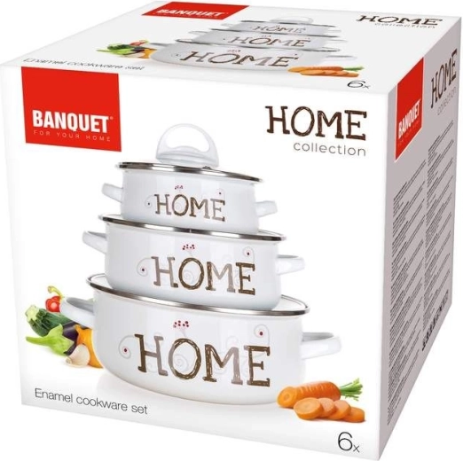 Sættet BANQUET Home tilbyder pålidelige gryder til ethvert køkken – lette, holdbare og nemme at vedligeholde. Det tidløse hvide design med teksten HOME passer både i moderne og klassiske interiører, og glaslåg med plastikknop giver kontrol over maden uden unødigt at løfte låget.
