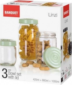 Sættet med 3 LINZI-dåser med volumen 425 ml, 660 ml og 1000 ml kan bruges praktisk talt til alle fødevarer, hvad enten det er krydderier, pasta eller sukker. Glasdåsen har et tætsluttende låg i granitlook.