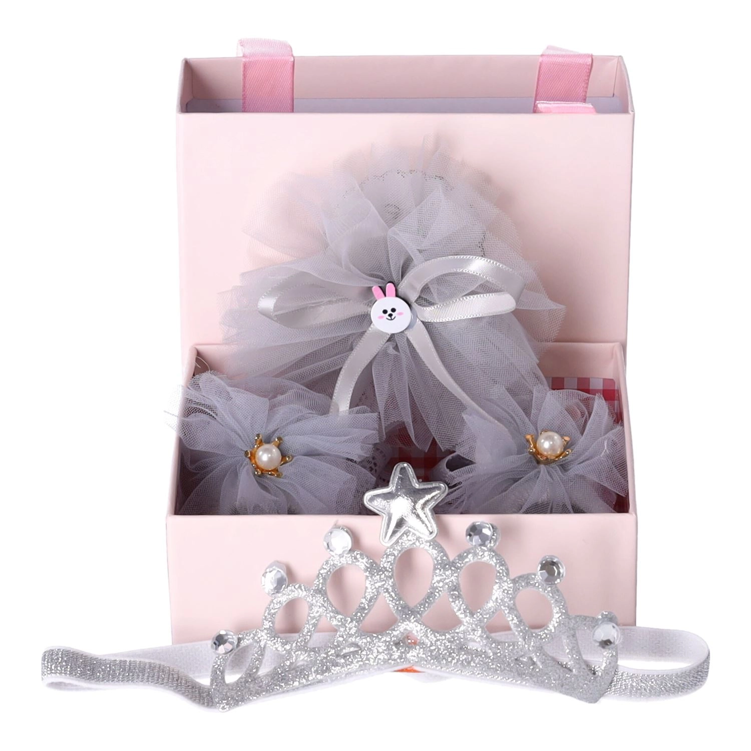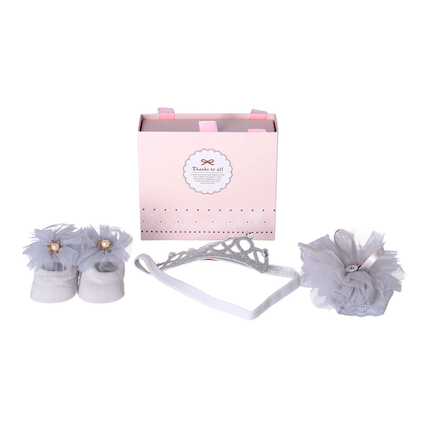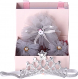 Leder du efter en sød og praktisk gave til en baby? Dette lysegrå gavesæt 3-i-1 kombinerer et blidt design med maksimal komfort. De ekstra elastiske hårbånd sidder flot, glider ikke og trykker ikke, mens pynt som blonde, tyl og perler giver både fotos og festlige øjeblikke et nænsomt udtryk.