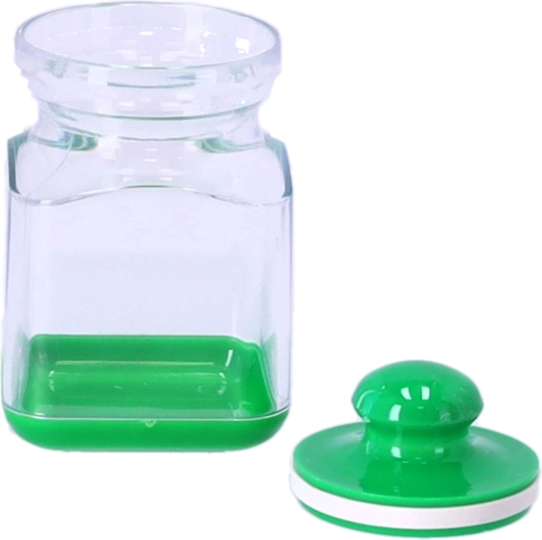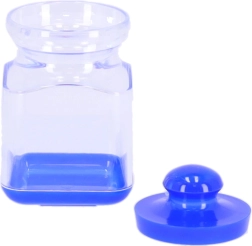 Plastbeholderen til krydderier har et låg med kugleformet greb, som er nemt at løfte, og som sikrer tæt lukning.