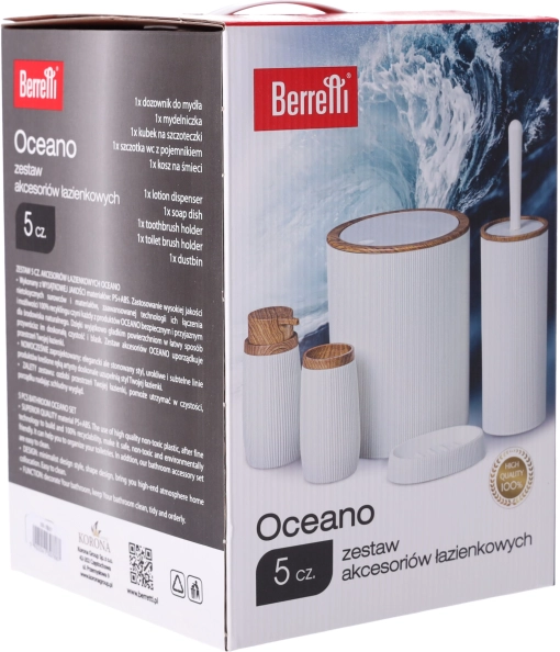 Den holdbare plast PS og ABS er let, stærk og ideel til fugtige miljøer. Spanden med svinglåg øger hygiejnen og begrænser lugtspredning, toiletbørsten opbevares i en diskret holder, og sæbedispenseren efterfyldes på et øjeblik. Alt er designet til daglig komfort og langvarig brug.