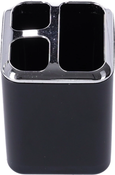 Det praktiske bæger med flere rum holder tandbørster, tandpasta og småting overskueligt samlet ét sted. Metaldetaljen og den blanke overflade matcher moderne badeværelser og gør vedligeholdelsen let.