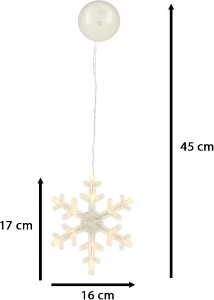 En stilfuld hængende LED-dekoration i form af et snefnug, der oplyser dit vindue og skaber en magisk julestemning. Takket være batteridrift kan den placeres hvor som helst uden kabler, og nem montering med sugekop sikrer hurtig fastgørelse. Det varme hvide 10 LED lys er ideelt til hyggelig vinterlig indendørs dekoration.