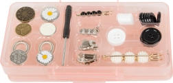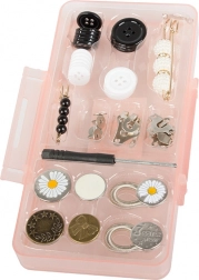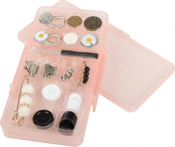 Sættet indeholder nåle, tråde og knapper i forskellige størrelser, hvilket muliggør bred anvendelse til forskellige typer reparationer.