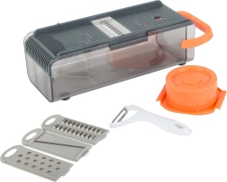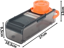 Den multifunktionelle skæremaskine og rivejern er designet til at lette din daglige madlavning. Den leveres med fire udskiftelige vedhæftninger, der passer til forskellige behov i dit køkken. Den gennemsigtige beholder med låg muliggør nem opbevaring af ingredienser i køleskabet uden at miste deres friskhed.