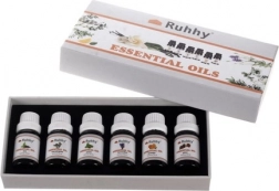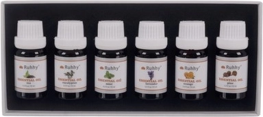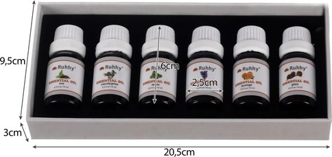 Sættet indeholder seks forskellige dufte som eukalyptus, appelsin, te træ, mynte, lavendel og fyrretræ. Hver olie er omhyggeligt forseglet i en flaske med et volumen på 10 ml.