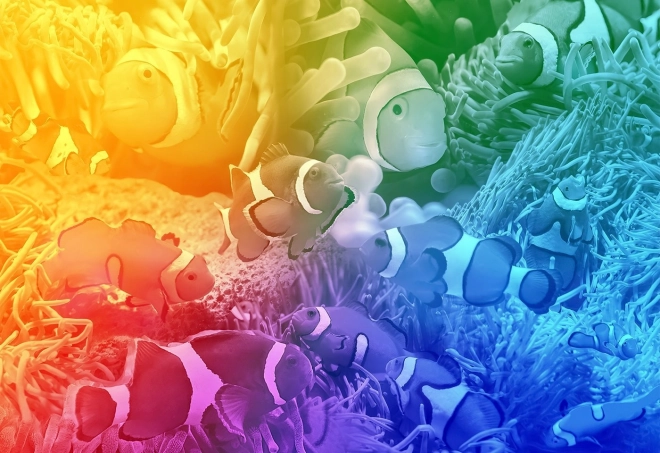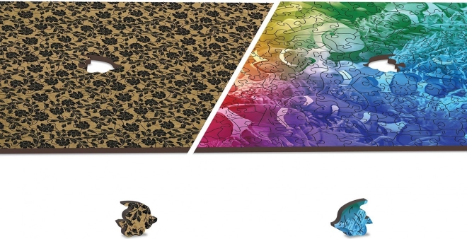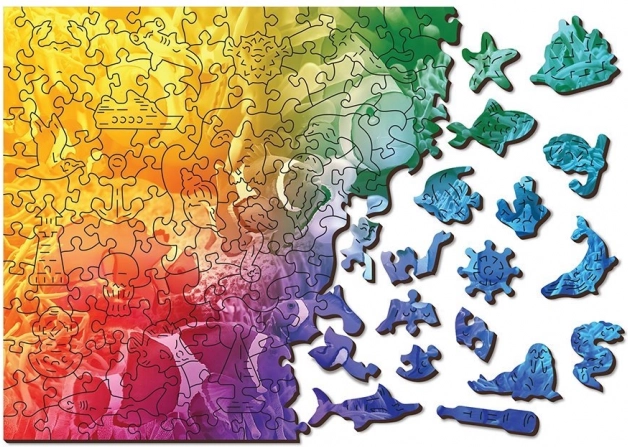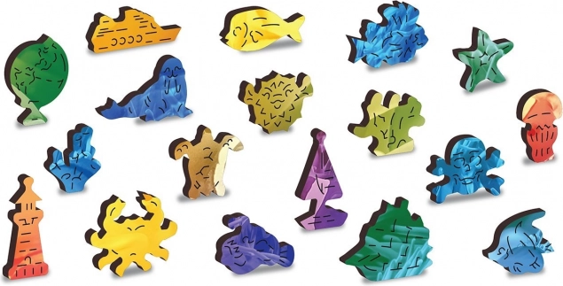 Oplev den farverige undervandsverden med motiv af tropiske fisk og underholdning, der ikke bliver kedelig. Med laserskårne brikker og dusinvis af originale former venter en fængende udfordring. Puslespillet er dobbeltsidet – på forsiden samler du det farverige motiv, på bagsiden et gentaget mønster efter formerne.