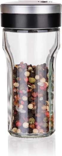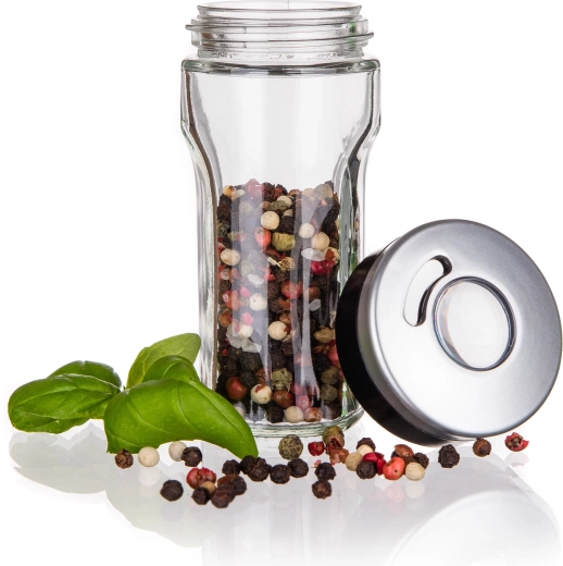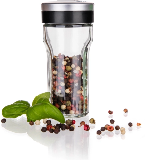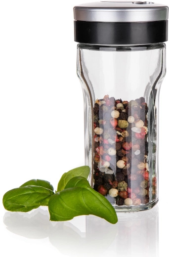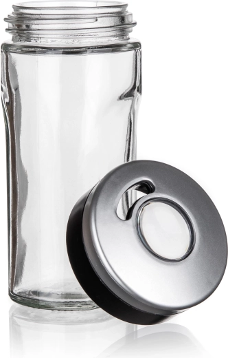 Krydderistativ VIRTU 80 ml. Glasbeholder til krydderier med plastlåg med en kapacitet på 80 ml. Krydderiglaset er universelt takket være låget, som er udstyret med 3 forskellige åbninger – fin, grov og universel. Glasset egner sig til både fintmalede og grovere typer krydderier og er ideelt til hele krydderier som nelliker og hel peber. Kun glasdelen kan tåle opvaskemaskine.