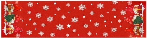 Elegant rød løber med hvide snefnug og stjerner, suppleret af charmerende nisser med gaver i enderne, skaber straks et festligt og hyggeligt miljø. Den står flot på en hvid dug såvel som alene og kan nemt matches med klassisk service.