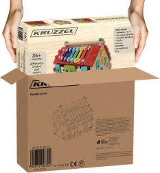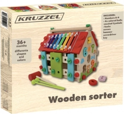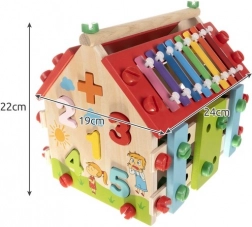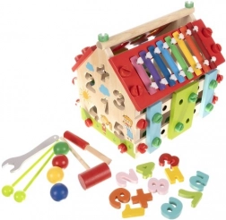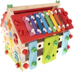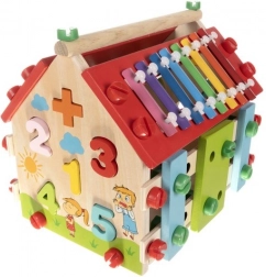 Hver side af huset indeholder forskellige aktiviteter, der støtter barnets udvikling. Indeholder bækkener, formeindsatser og en lille hammer.