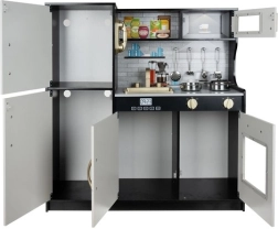 XL legekøkken i træ (MDF) imponerer med detaljer og holdbarhed. LED-lampen kan placeres under skabet, i skabet eller i ovnen, så børn kan nyde en ægte madlavningsstemning selv i dæmpet lys. De drejelige knapper på komfuret giver realistiske “klik”-lyde, som gør legen endnu mere medrivende.