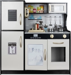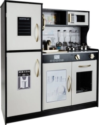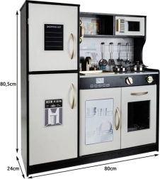 Stilfuldt XL trælegekøkken fra KRUZZEL i sort, hvid og guld giver børn realistisk madlavningsleg. Det byder på LED-belysning, lydeffekter fra kogepladerne, bevægelige elementer og masser af tilbehør inkluderet (gryde, pande, låg, 4 skeer). Aftagelig vask, ovn, mikroovn og opbevaringsskabe med “klik” stimulerer kreativitet, læring gennem leg og rolleleg.