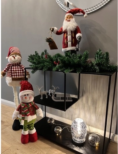 De praktiske tråde i huen og ærmerne gør det nemt at ændre form og håndenes position og dermed finjustere hele scenen. De stabile sko holder figuren sikkert på plads – den passer perfekt ved hoveddøren, på trappen, i vindueskarmen og ved juletræet.