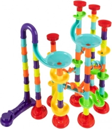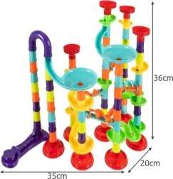 Denne farverige kuglebane giver uendelige muligheder for byggeri og eksperimenter. Med 113 elementer skaber du varierede opsætninger, hvor kuglerne bevæger sig i alle retninger (3D). Sættet indeholder 30 glaskugler, så både søskende og venner kan være med.