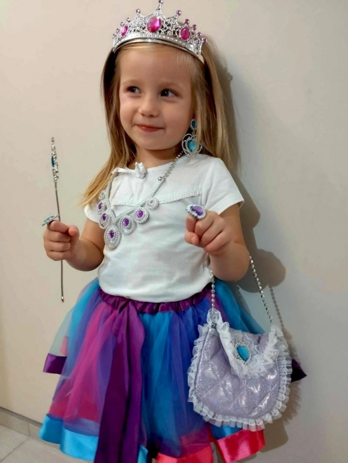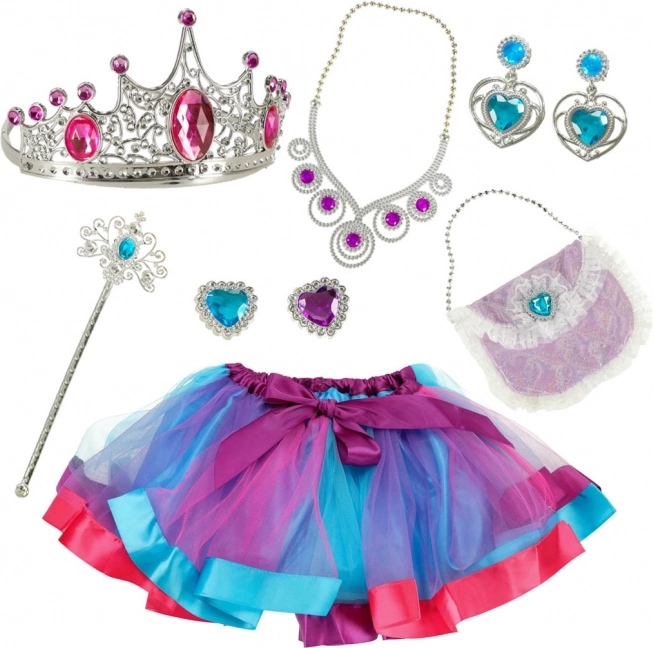 Det magiske 9-delte sæt forvandler ethvert barn til en ægte prinsesse på et øjeblik. Det farverige tutuskørt i toner af lyserød, lilla og blå udmærker sig ved luftige tyl-lag og en behagelig talje. En elegant tiara med lyserøde sten, glitrende halskæde og øreringe understreger det festlige look, mens den magiske tryllestav og den søde håndtaske fuldender outfittet.