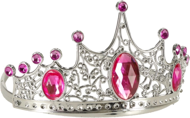 Sølvfarvet tiara med lyserøde sten, matchende halskæde og øreringe giver enhver udklædning en fortryllende glans. To ringe fuldender sættet ned til mindste detalje.