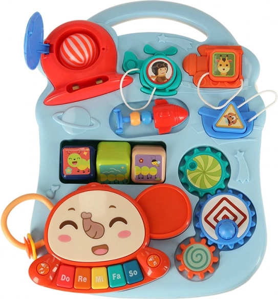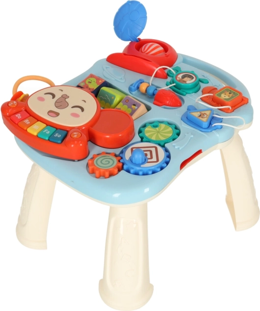 Produktet er lavet af robust plast og indeholder forskellige interaktive elementer som klaver, plasttandhjul, klodser og en kurv til bolde, der understøtter barnets kognitive udvikling.
