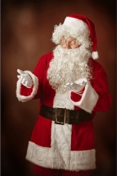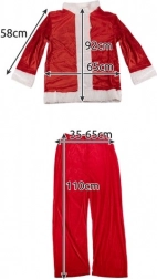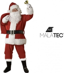 - Komplet udstyr (13 dele) – jakke, bukser, hue, paryk, skæg med moustache, handsker, briller, bælte, overtræk til sko, sæk og klokke.