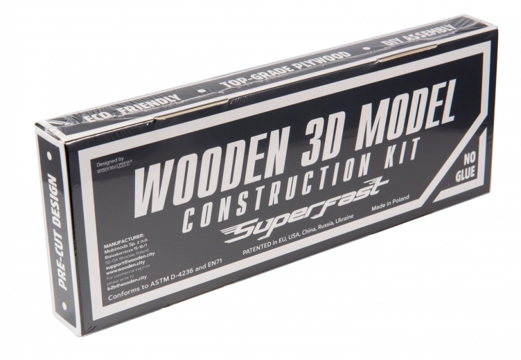 Uden plastemballage, i kvalitets krydsfiner og med mulighed for at male modellen i dine yndlingsfarver.
