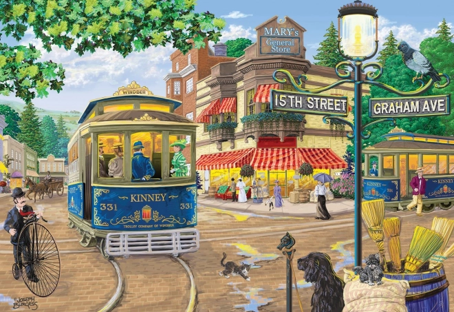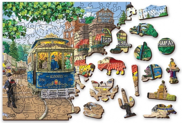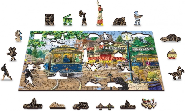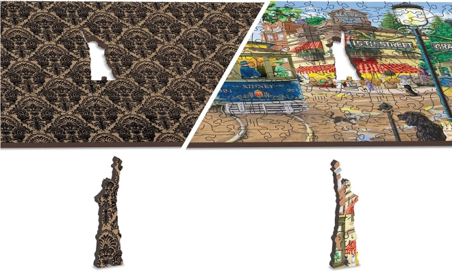 Elegant træpuslespil med motiv af en nostalgisk gade, der tilbyder to veje til fuldførelse: forsiden med en detaljeret illustration og bagsiden med et mønster til lægning efter former. Du får en højere sværhedsgrad takket være specialudskårne brikker, der forestiller dyr, bygninger og genstande, og som også kan bruges som små figurer. Et ideelt valg for voksne og dygtigere yngre læggere, der søger en original udfordring.