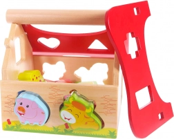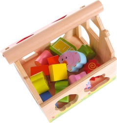 Farvede træklodser med tilsvarende formede åbninger hjælper børn med at øve sortering, logik og genkendelse. Nogle dele har form som bondegårdsdyr, så børnene udvider ordforrådet og fantasien på en naturlig måde.