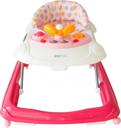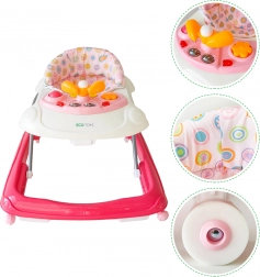 Det lyserøde ECO TOYS-gåstativ understøtter barnets naturlige motoriske udvikling takket være det interaktive panel og den stabile konstruktion. Forhjul med 360° drejning giver jævn bevægelse, mens de bageste silikonehjul forhindrer kørsel baglæns. Den nederste stabiliseringsramme minimerer risikoen for væltning, så dit barn kan koncentrere sig trygt om sine første skridt.