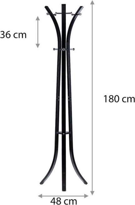 Dette fritstående stativ i moderne, minimalistisk stil giver en funktionel løsning til daglig organisering af tøj og tilbehør. Tre øverste arme tilbyder to ophængspunkter hver, suppleret af tre nederste kroge til hatte, håndtasker eller paraplyer. Takket være den tredobbelte stabile base forbliver stativet solidt selv ved større belastning.