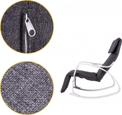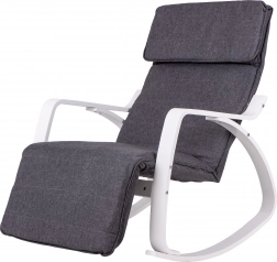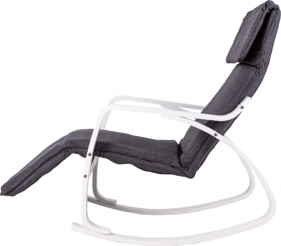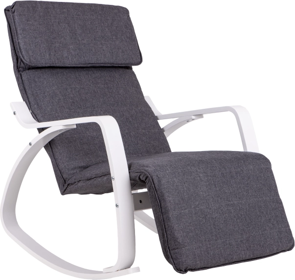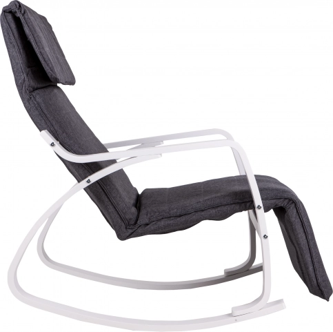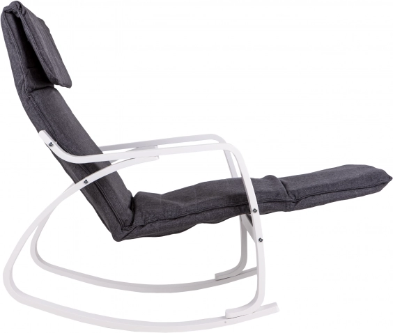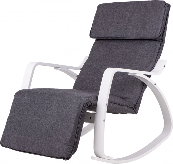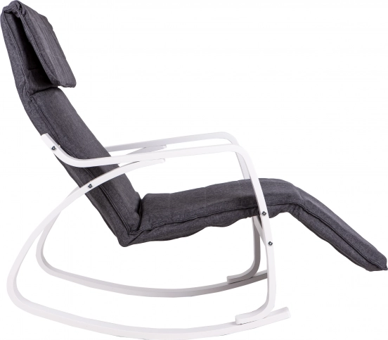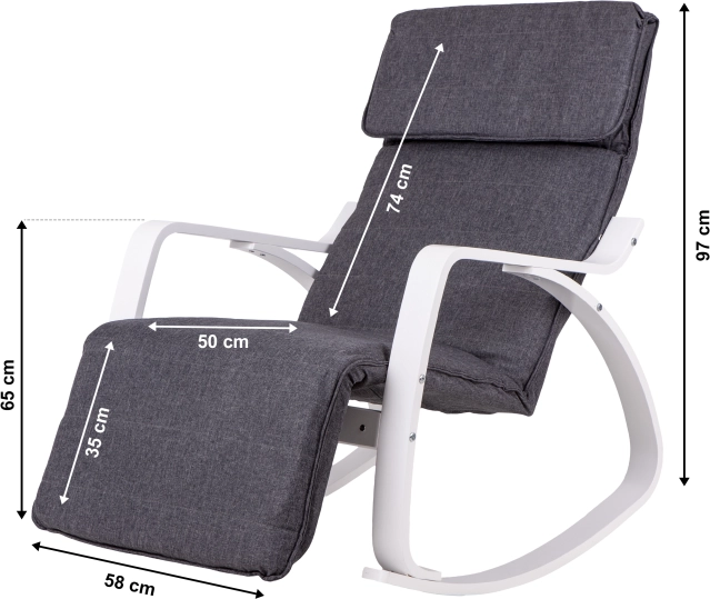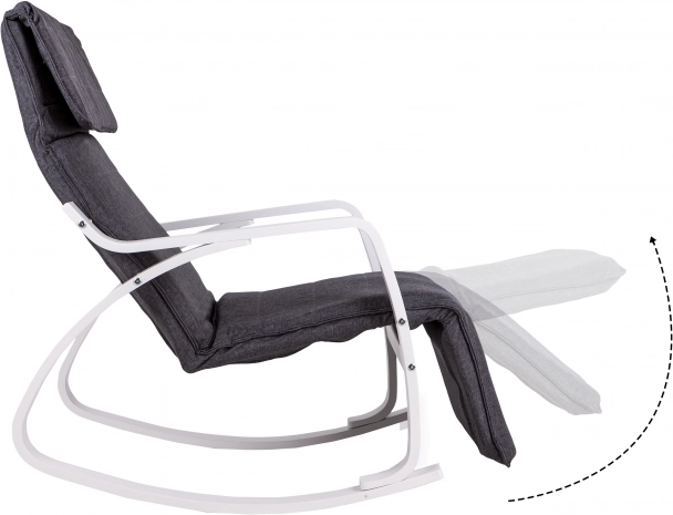 Gyngestolen ModernHome er designet til maksimal komfort og ro. Dens solide metalramme i hvid er suppleret med grå tekstilpolstring, der tilbyder en hyggelig siddeoplevelse. Med femtrins justerbar fodstøtte kan du nemt finde den ideelle position.