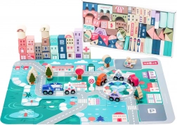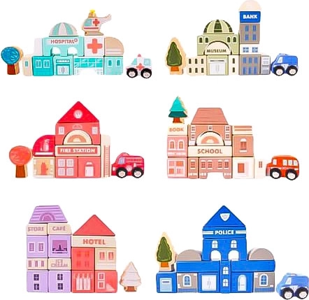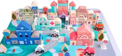 Træklodser for børn over 3 år er ideel til udvikling af manuelle færdigheder og rumlig forestillingsevne. Sættet omfatter 115 elementer, som inkluderer forskellige bygninger som hotel, hospital, bank, politistation, skole og brandstation. Hver bygning er detaljeret designet og suppleret med et tilsvarende køretøj.