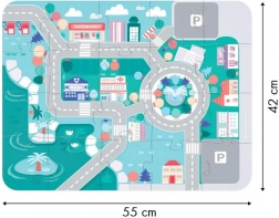 Dette sæt er malet med økologiske farver, der er sikre for børn. Den indstillede byvej på puslespillet underlag giver mulighed for at skabe en kompleks legeplads, der fremmer kreativ og interaktiv leg.