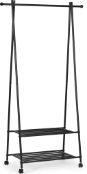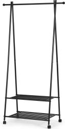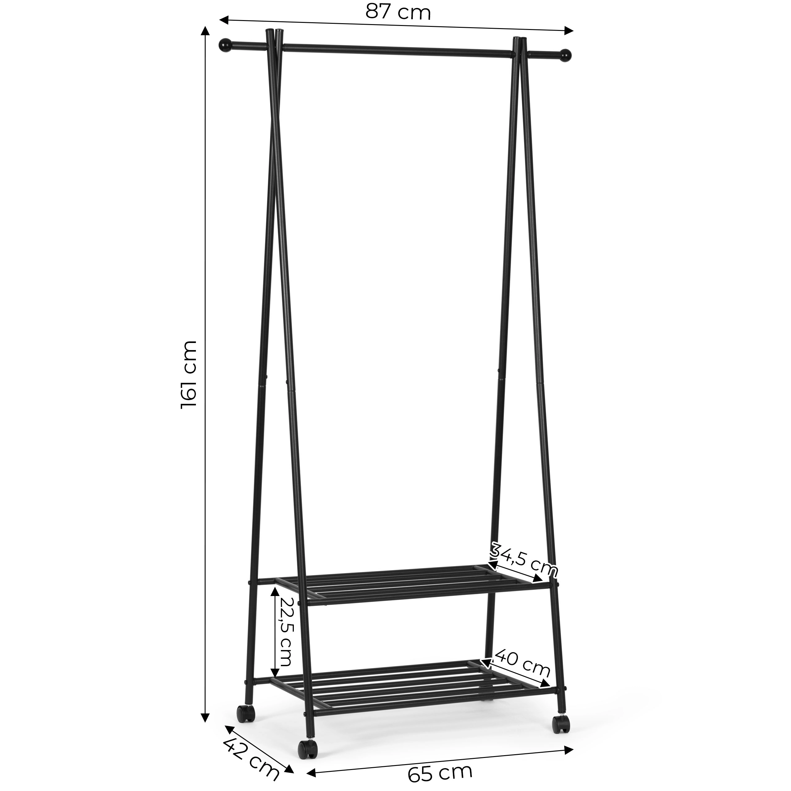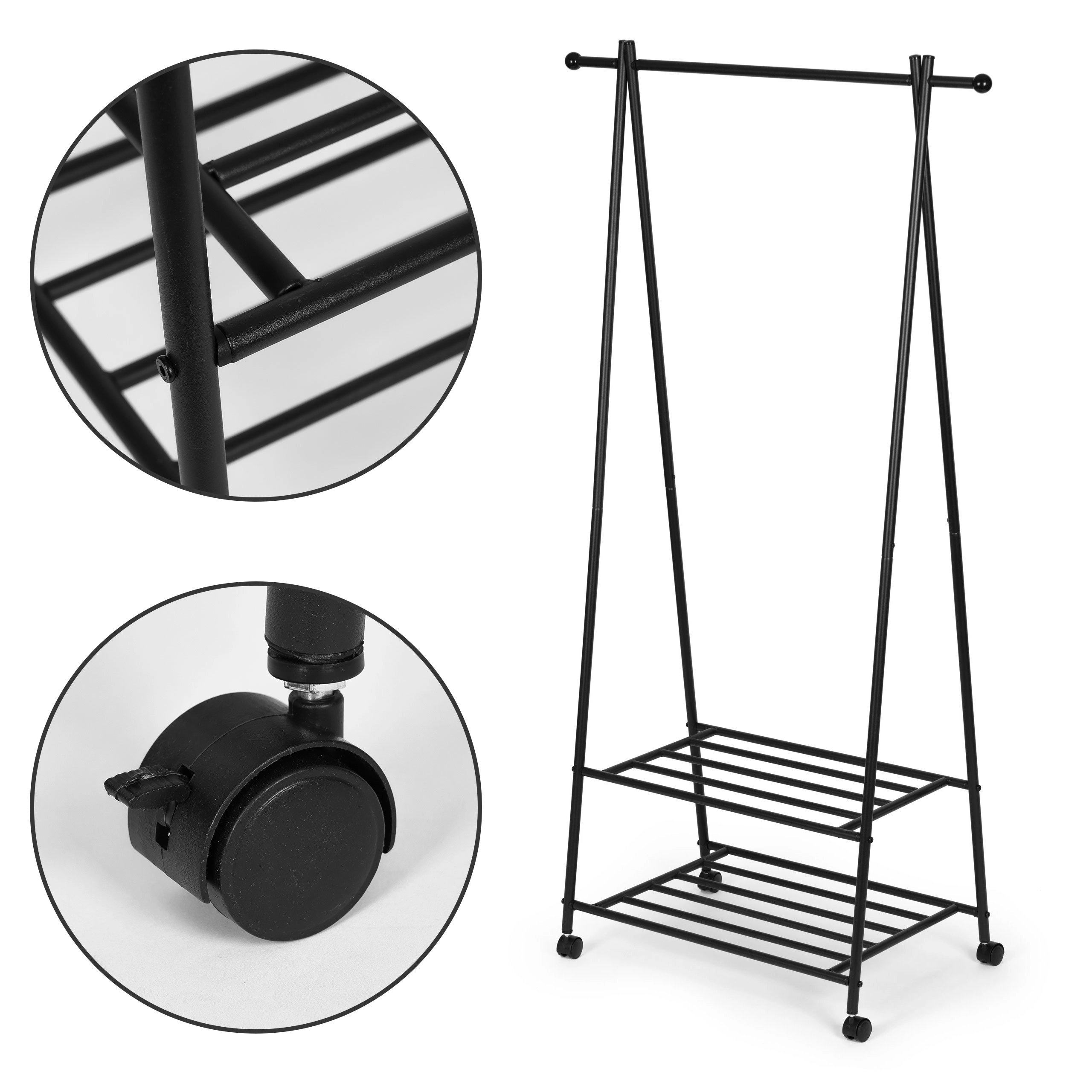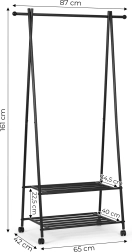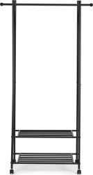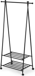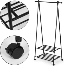 Den øvre stang på 77 cm er beregnet til ophængning af jakker og skjorter, mens de sidehængte kroge er ideelle til håndtasker, rygsække eller tørklæder og huer. De nederste dele af stativet er udstyret med to funktionelle hylder til mindre beklædning eller fodtøj. Metalkonstruktionen sikrer stabilitet selv ved stor belastning.