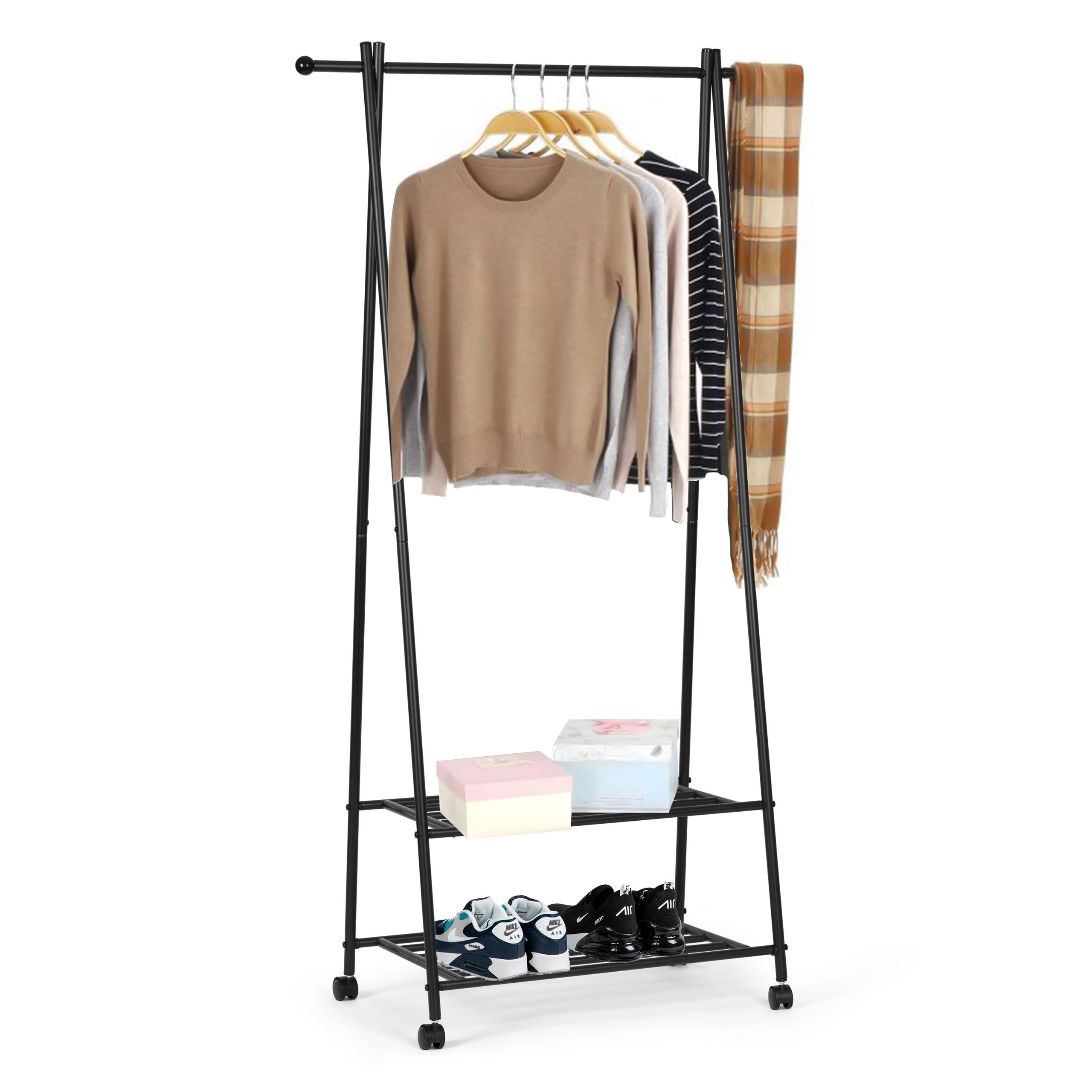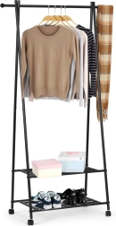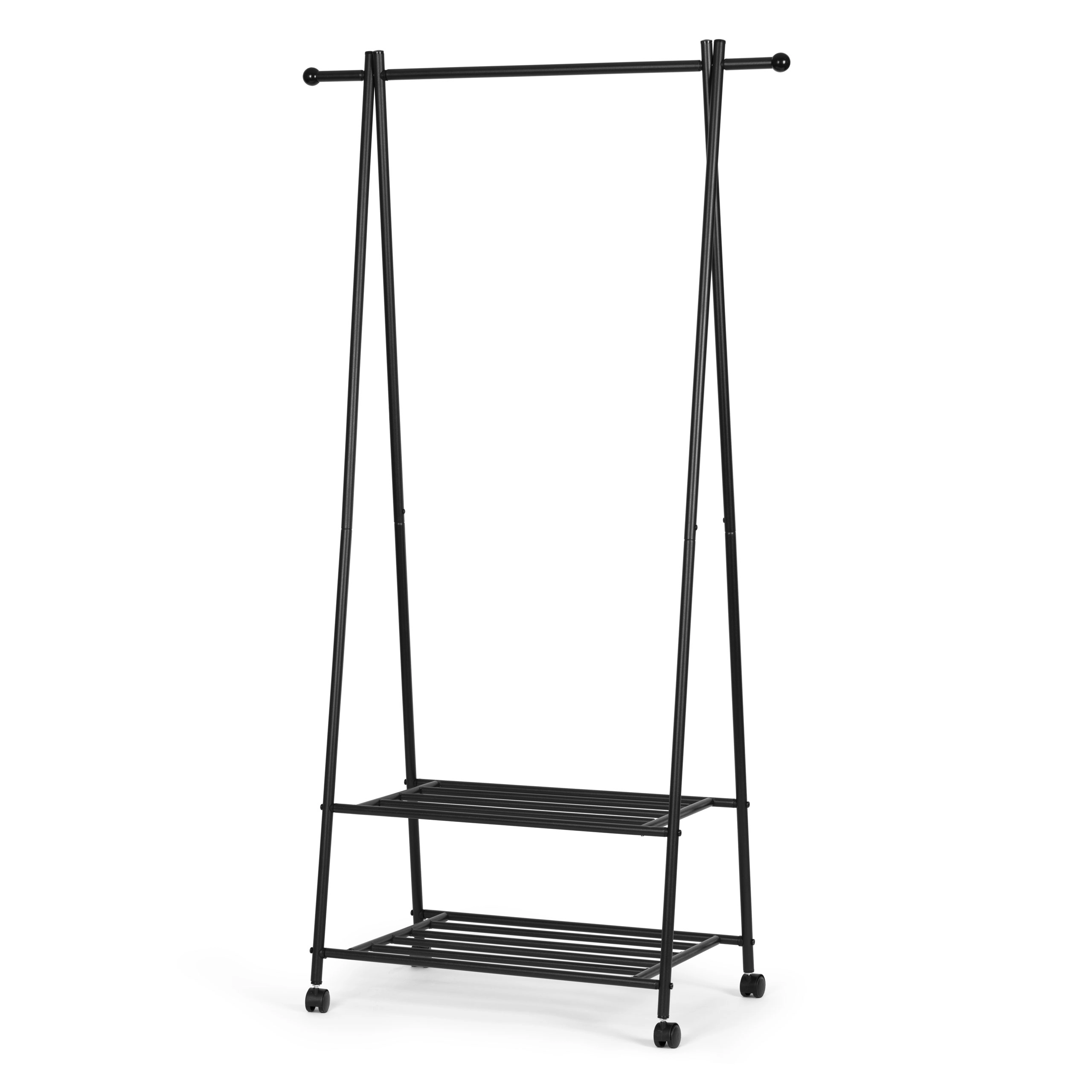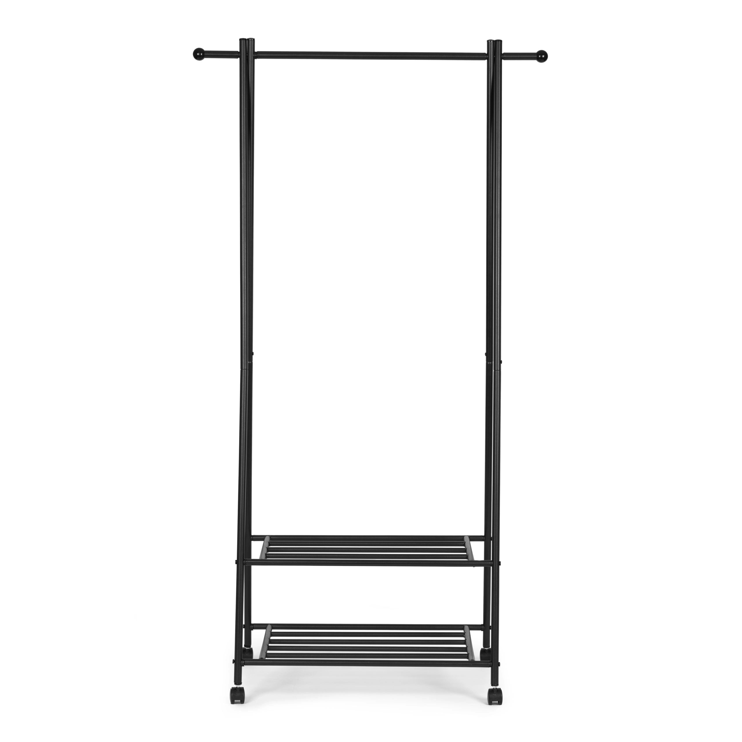 Den øvre stang på 77 cm er beregnet til ophængning af jakker og skjorter, mens de sidehængte kroge er ideelle til håndtasker, rygsække eller tørklæder og huer. De nederste dele af stativet er udstyret med to funktionelle hylder til mindre beklædning eller fodtøj. Metalkonstruktionen sikrer stabilitet selv ved stor belastning.