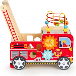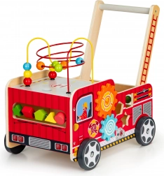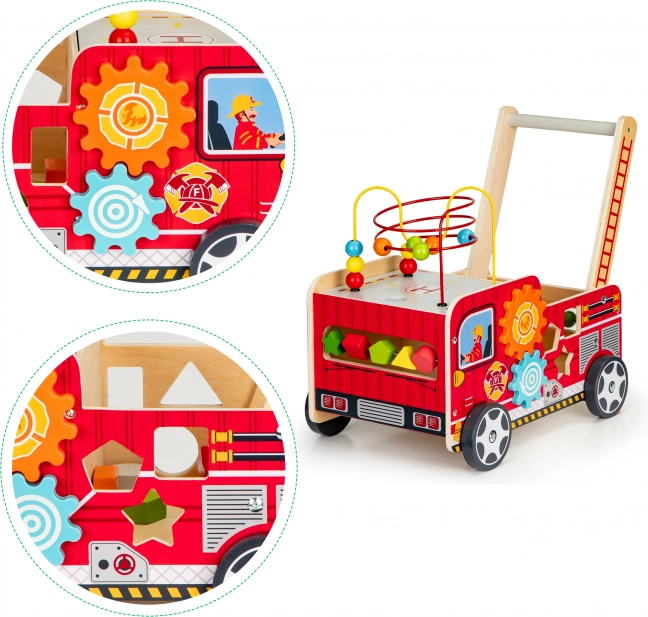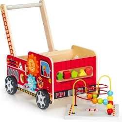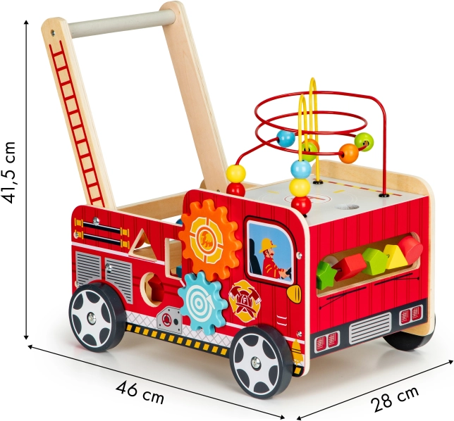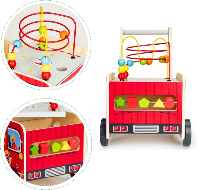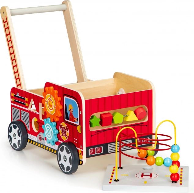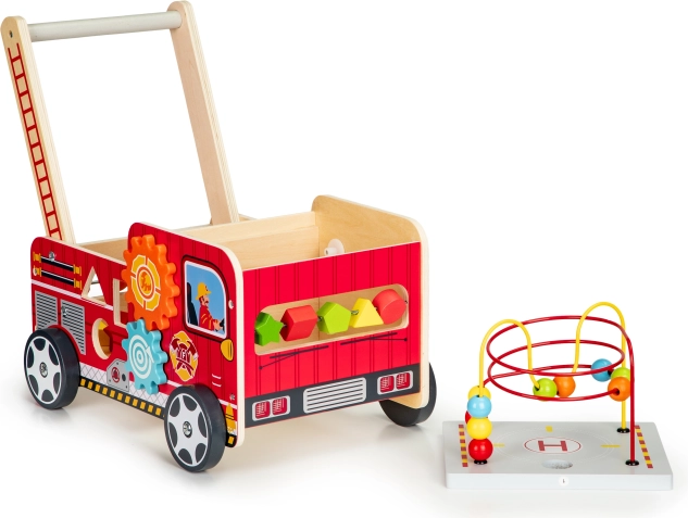 Det træformede brandbil-walker er en ideel hjælper til dit barns første skridt. Walker er designet til at give stabilitet og samtidig sjov gennem forskellige interaktive elementer som tandhjul, perlelabyrinter og formsortering.