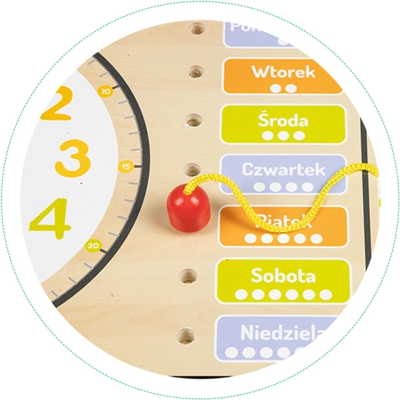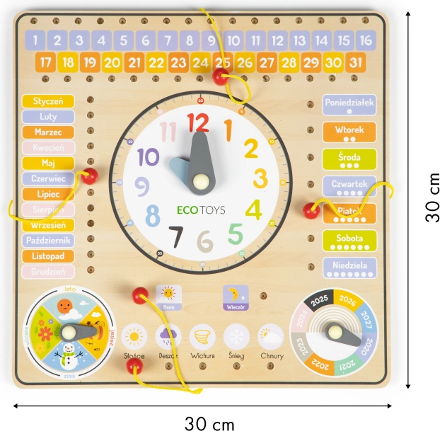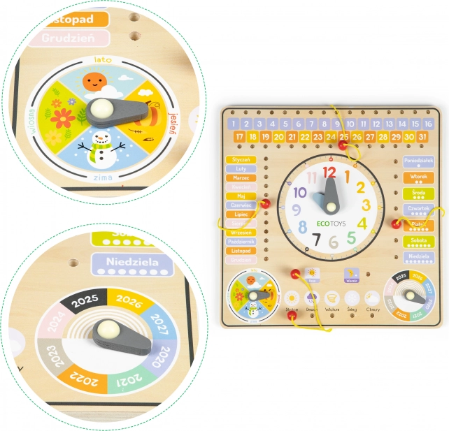 Tavlen indeholder polske betegnelser, men er også ideel for danske børn takket være sin lette forståelighed og robuste træ-konstruktion. Den hjælper børn med bedre at forstå årstidernes variation via en roterende viser. På tavlen kan man også markere året i intervallet 2020-2027.
