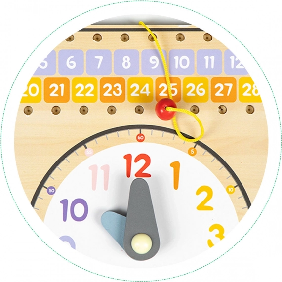 Denne smukke trælæringstavle giver børn en legende måde at lære om ugedage, måneder, årstider samt hvordan man korrekt læser tiden. Læring bliver sjovt og udvikler samtidig barnets finmotorik.