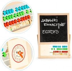 Under tavlen er der placeret en farverig regneramme og en stang med tal og matematiske operationer. Dette gør det muligt for barnet at lære grundlæggende regning gennem leg. Legetøjet indeholder også en klokke med bevægelige visere, som hjælper med at lære tiden.
