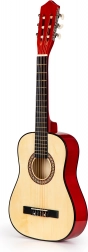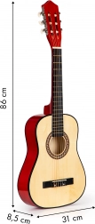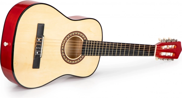 Denne ECOTOYS børneguitar er designet til så vidt muligt at minde om et rigtigt instrument – fra stemmeskruer over stol til gribebræt med 18 bånd. Kombinationen af metal- og nylonstrenge gør det lettere for begyndere at spille og giver en afbalanceret, behagelig lyd.