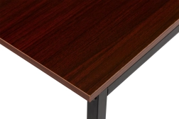 Dette træskrivebord er fremstillet af materialer i høj kvalitet, som kombinerer træ og metal for maksimal styrke og holdbarhed. Bordets overflade er belagt med mørkebrun laminat, hvilket sikrer et elegant udseende og nem vedligeholdelse.