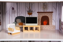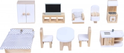 Sættet indeholder farverige træelementer som skab, TV-bænk, lænestol, toilet, komfur, seng, bord og to stole, køkkenbord og andre komponenter, der forvandler huset til et realistisk hjem i skala.