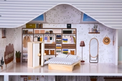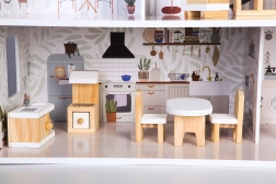 Dukkehus har tre separate niveauer og i alt fire rum, som er stiliseret efter deres formål. Pakken indeholder 10 stykker træmøbler og forskellige tilbehør som støvsuger, guitar, spejl eller hundehus. Hvert element kan frit flyttes og arrangeres efter behov.