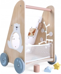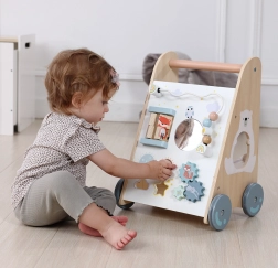Den trægåvogn til børn fra 18 måneder giver ikke kun hjælp til at lære at gå, men også masser af sjov og udvikling af manuelle færdigheder. Det pædagogiske panel indeholder:
