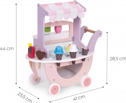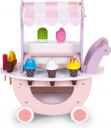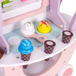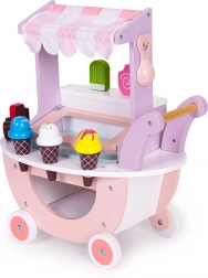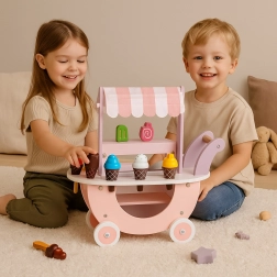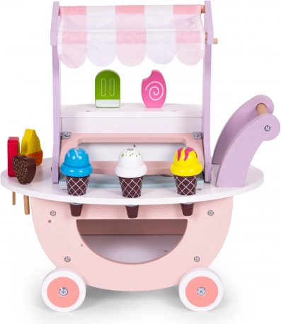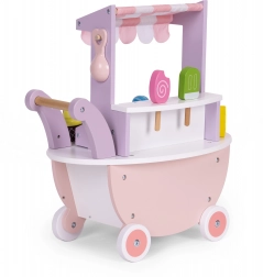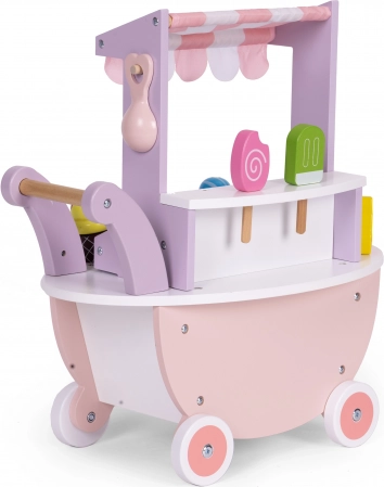 Giv børnene timevis af kreativ leg med ECOTOYS isbod. Takket være den mobile vogn med lille tag og rigt tilbehør lever børn sig nemt ind i rollen som både ekspedient og kunde. Træudførelse, afrundede kanter og blide farver understøtter rolig og sikker leg.