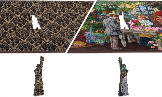 Et stilfuldt træpuslespil med motiv af en livlig blomsterhandel vil glæde både elskere af detaljerede illustrationer og mere krævende puslespilsbyggere. Takket være det dobbelt-sidede design får du to puslespil i ét – forside med en farverig scene fuld af blomster og bagside med mønster til lægning efter former. Unikke udskæringer i form af dyr, personer og genstande fungerer som små figurer og giver lægningen en ny dimension.