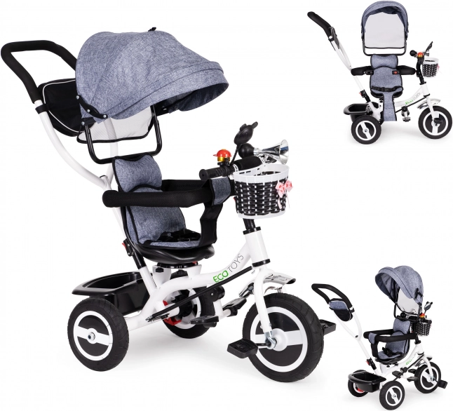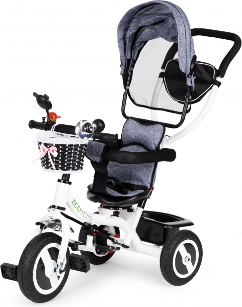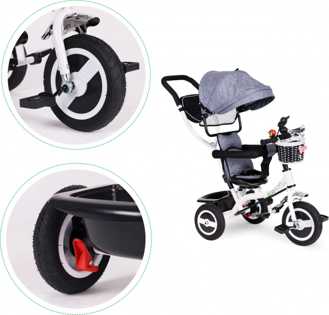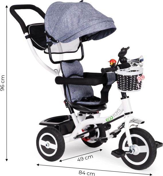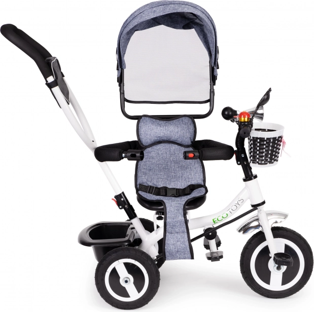 Med ECOTOYS trehjuleren udforsker dit barn verden sikkert og komfortabelt. Takket være den bløde ryglænspude sidder barnet behageligt, mens seler og sikkerhedsbøjler beskytter mod fald. Den sammenklappelige kaleche beskytter mod sol og regn. Den særlige rammekonstruktion og det drejelige sæde gør det let at stige på selv for de mindste.