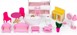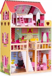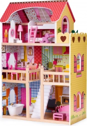 Hele dukkehuset er lavet af kvalitets træ, hvilket betyder, at legetøjet vil holde i mange år. I stueetagen findes badeværelse og stue med sofa til dukken. De to første niveauer er forbundet med hvide trætrapper. Anden sal er udstyret med køkken og spisestue samt trægelænder, der forhindrer dukken i at falde. På øverste etage finder du et soveværelse til dukken med adgang til en terrasse.